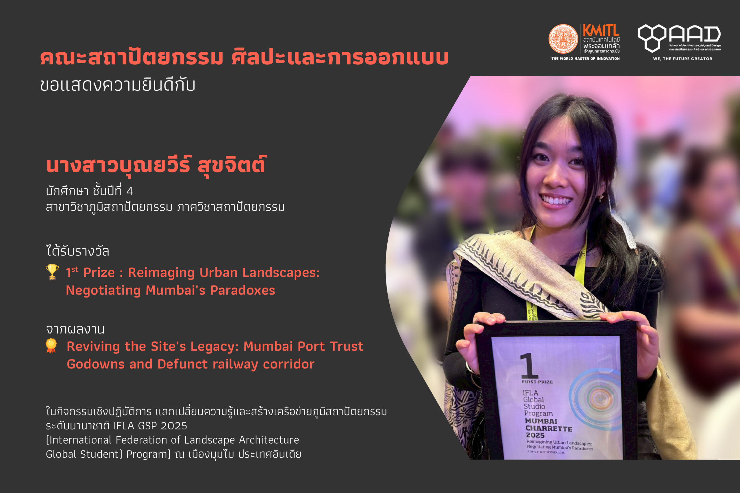 ขอแสดงความยินดีกับ นางสาวบุณยวีร์ สุขจิตต์ นักศึกษา ชั้นปีที่ 4 สาขาวิชาภูมิสถาปัตยกรรม ภาควิชาสถาปัตยกรรม