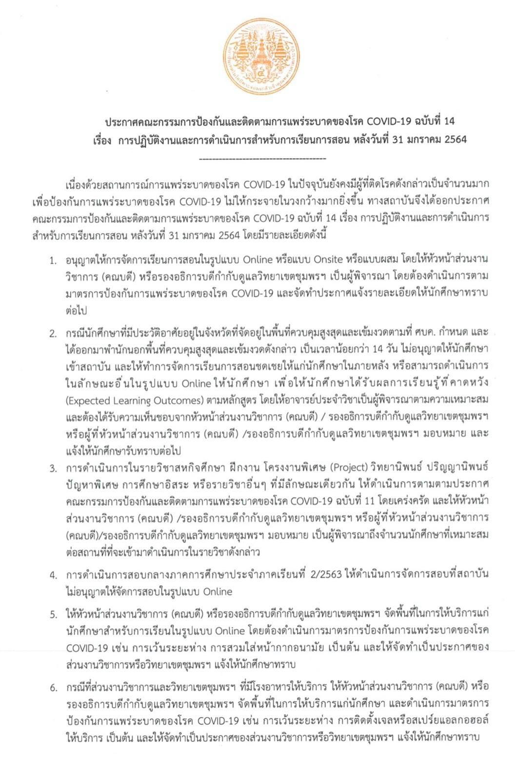 ประกาศคณะกรรมการป้องกันและติดตามการแพร่ระบาดของโรค COVID-19 ฉบับที่ 14 เรื่อง การปฏิบัติงานและการดำเนินการสำหรับการเรียนการสอน หลังวันที่ 31 มกราคม 2564