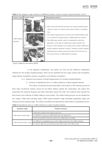 Table 2 The adaptive usage methods of different products used by visually impaired baristas. (Cont.) Product Type Product images Distinguishing methodCoffee Making Machines1. When faced with identical machines, the visually impaired person Will put a mark on a machine with a piece of tape or something else. 2. The visually impaired person will touch the machine before using it to memories the shape features to differentiate the machine. 3. The coffee bean grinders need to be adjusted for grind size depending on the type of coffee being made. However, this function is often indicated only visually, which makes it difficult for visually impaired individuals to discern. Therefore, visually impaired individuals place markers around the scale of the knob and use their sense of touch to differentiate the settings. Source: Made by the author (2025) In the adaptive modification, the author can find out the effective modification methods for the visually impaired people, which can be classified into four types: tactile mark recognition; shape feature recognition; position recognition; and olfactory recognition. 5.1.2 Research and analysis of Design Requirements for Visually Impaired Baristas 1) Analysis of operational errors in coffee-making by visually impaired baristas. The author conducted focused observation and analysis of the learning process at Khon Kaen Vocational Training School for the Blind. Before starting the observation, the author first researched the teaching situation and basic information about the staff. The students have learned the basic theory and methods of coffee making to some extent. The coffee-making process can be divided into four stages: Coffee bean grinding stage; Coffee liquid extraction stage; Beverage preparation stage; and Packing and tool-cleaning stage. The author recorded and organized the observations of operational errors. Table 3 Operational errors in coffee-making by visually impaired baristas. Operation stage Problem Summary Coffee bean grinding stageCoffee beans spilled when being poured out It is difficult to scoop out coffee beans from the Sealed Jars It was not possible to find the entrance for coffee beans accurately Coffee liquid extraction stage It is difficult to completely pour out the coffee power from the coffee extractor. It is hard to align the cup with the pump bottle nozzle when filling water. - 101 -