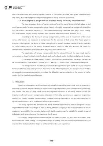 which can effectively help visually impaired baristas to complete the coffee making task more efficiently and safely, thus enhancing their independent operation ability and work experience. 6.2 Result of product design methods of coffee-making for visually impaired baristas The core of product design is \meet human needs. Sensory compensation design targets vulnerable groups such as people with disabilities and the elderly. It enhances the product's comprehensibility through feedback from vision, touch, hearing, and other senses, helping visually impaired users perceive their environment. (Norman, 2013) According to the theory of sensory compensation, in the case of impairment of the visual sense, other senses are enhanced to compensate for the absence of that sense. This theory plays an important role in guiding the design of coffee making tools for visually impaired baristas. A design approach to coffee making products for visually impaired baristas needs to take into account the needs for differentiation, orientation and control that they encounter in their work. The application of sensory compensation to the product through the case study can be summarized as shape feedback, color feedback, auditory feedback, tactile feedback and physical structure. In the design of coffee brewing products for visually impaired baristas, the design method can be summarized into three aspects: 1) Clear product feedback, 2) Ease of use, 3) Multisensory feedback. The design solution should fully incorporate the operational pain points of visually impaired baristas in different production processes. According to the different problems, the designer should find the corresponding sensory compensations to reduce the difficulties and uncertainties in the process of coffee making for the visually impaired baristas.7. Discussion Based on observations and interviews with visually impaired baristas in real work environments, this study found that they face three core needs when using coffee-making tools: differentiation, positioning, and control. The product usage needs of visually impaired individuals in this study further validate the importance of multi-sensory compensation strategies in their daily operations, as supported by previous research on visually impaired product design. However, existing equipment is still primarily designed for sighted individuals and lacks targeted accessibility optimizations. This study explores the principles and design methods applicable to product design for visually impaired baristas. In the early stages of product design, different user groups should be considered to ensure equipment accessibility. For example, buttons with tactile markings can be suitable for visually impaired individuals while also enhancing the experience for all users. In summary, design not only meets the practical needs of users, but also helps to create a fairer environment for coffee making. Future product design on making tools for visually impaired baristas could explore other features at other stages to further enhance the user experience.- 108 -