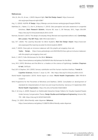 References Ahn, B., Kim, M., & Lee, J. (2023). Beyond Sight. Red Dot Design Award. https://www.reddot.org/project/beyond-sight-65867 Ang, Y.J. (2022). HUEPIN. IF Design. https://ifdesign.com/en/winner-ranking/project/huepin/504766 Mathilde, B.L., Fabien, C.S., Ron K., & Maurice, P., (2010). Odor perception and odor awareness in congenital blindness. Brain Research Bulletin, Volume 84, Issue 3, 28 February 2011, Pages 206-209. https://doi.org/10.1016/j.brainresbull.2010.12.014 Norman, Donald A. (2013). The design of everyday things (Revised and expanded editions ed.). Cambridge, MA London: The MIT Press. ISBN 978-0-262-52567-1. Gao, W.T. (2020). The Learning Recorder for Blind Students. Red Dot Design Award. https://www.reddot.org/project/the-learning-recorder-for-blind-students-48399 Joshi, T. (2023). Chess gets an inclusive makeover with this playful yet engaging chess set. Yanko Design, https://www.yankodesign.com/2023/06/25/chess-gets-an-inclusive-makeoverwith-this-playful-yet-engaging-chess-set/ Kevin, C. (2017). Folks Kitchenware for the Blind. Behance. https://www.behance.net/gallery/56339293/Folks-Kitchenware-for-the-Blind Levy, W.H. (1872). Blindness and the Blind or: a treatise on the science of typhlology. London: Chapman & Hall, (1872),63. Paul, B.R. & Stephen, W.K. (2003). Sensory substitution and the human%u2013machine interface. Trends in Cognitive Sciences, Volume 7, Issue 12, 541 - 546. https://doi.org/10.1016/j.tics.2003.10.013 World Health Organization. (2019). World report on vision. World Health Organization. ISBN: 978-92-4-151657-0 WHO Programme for the Prevention of Blindness and Deafness. (2003). Consultation on development of standards for characterization of vision loss and visual functioning : Genveva, 4-5 September 2003. World Health Organization. https://iris.who.int/handle/10665/68601 Wei, Z. & Cong, A., (2009). Research on Multimodal Interaction Design Patterns for Visually Impaired People Under Sensory Compensation Theory. Design Studies and Intelligence Engineering, Volume 383, 799 - 808. https://doi.org/10.3233/FAIA231495 Zhang, C.K. (2021). Blind friendly water dispenser. Behance. https://www.behance.net/gallery/113280701/Blind-friendly-water-dispenser - 109 -
