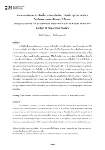 %u0e41%u0e19%u0e27%u0e17%u0e32%u0e07%u0e01%u0e32%u0e23%u0e2d%u0e2d%u0e01%u0e41%u0e1a%u0e1a%u0e40%u0e27%u0e47%u0e1a%u0e44%u0e0b%u0e15%uf70e%u0e2a%u0e37%u0e48%u0e2d%u0e1b%u0e23%u0e30%u0e2a%u0e21%u0e40%u0e1e%u0e37%u0e48%u0e2d%u0e2a%uf70a%u0e07%u0e40%u0e2a%u0e23%u0e34%u0e21%u0e01%u0e32%u0e23%u0e17%uf70a%u0e2d%u0e07%u0e40%u0e17%u0e35%u0e48%u0e22%u0e27%u0e0a%u0e38%u0e21%u0e0a%u0e19%u0e15%u0e33%u0e1a%u0e25%u0e23%u0e30%u0e1a%u0e33%u0e43%u0e19%u0e1a%u0e23%u0e34%u0e1a%u0e17%u0e02%u0e2d%u0e07%u0e01%u0e32%u0e23%u0e17%uf70a%u0e2d%u0e07%u0e40%u0e17%u0e35%u0e48%u0e22%u0e27%u0e2d%u0e22%uf70a%u0e32%u0e07%u0e23%u0e31%u0e1a%u0e1c%u0e34%u0e14%u0e0a%u0e2d%u0e1aDesign Guidelines for a Multimedia Website to Facilitate Rabam Within the Context of Responsible Tourism %u0e23%u0e31%u0e07%u0e2a%u0e34%u0e21%u0e31%u0e19%u0e15%uf70e%u0e40%u0e01%u0e34%u0e14%u0e40%u0e17%u0e27%u0e321 %u0e01%u0e34%u0e15%u0e15%u0e34%u0e0a%u0e31%u0e22 %u0e40%u0e01%u0e29%u0e21%u0e28%u0e32%u0e19%u0e15%u0e34%u0e4c2 %u0e1a%u0e17%u0e04%u0e31%u0e14%u0e22%uf70a%u0e2d%u0e07%u0e32%u0e19%u0e27%u0e34%u0e08%u0e31%u0e22%u0e19%u0e35%u0e49%u0e21%u0e38%uf70a%u0e07%u0e28%u0e36%u0e01%u0e29%u0e32%u0e41%u0e25%u0e30%u0e1e%u0e31%u0e12%u0e19%u0e32%u0e41%u0e19%u0e27%u0e17%u0e32%u0e07%u0e01%u0e32%u0e23%u0e2d%u0e2d%u0e01%u0e41%u0e1a%u0e1a%u0e40%u0e27%u0e47%u0e1a%u0e44%u0e0b%u0e15%uf70e%u0e2a%u0e37%u0e48%u0e2d%u0e1b%u0e23%u0e30%u0e2a%u0e21%u0e40%u0e1e%u0e37%u0e48%u0e2d%u0e2a%uf70a%u0e07%u0e40%u0e2a%u0e23%u0e34%u0e21%u0e01%u0e32%u0e23%u0e17%uf70a%u0e2d%u0e07%u0e40%u0e17%u0e35%u0e48%u0e22%u0e27%u0e0a%u0e38%u0e21%u0e0a%u0e19%u0e15%u0e33%u0e1a%u0e25%u0e23%u0e30%u0e1a%u0e33%u0e43%u0e19%u0e1a%u0e23%u0e34%u0e1a%u0e17%u0e02%u0e2d%u0e07%u0e01%u0e32%u0e23%u0e17%uf70a%u0e2d%u0e07%u0e40%u0e17%u0e35%u0e48%u0e22%u0e27%u0e2d%u0e22%uf70a%u0e32%u0e07%u0e23%u0e31%u0e1a%u0e1c%u0e34%u0e14%u0e0a%u0e2d%u0e1a %u0e42%u0e14%u0e22%u0e40%u0e19%uf70b%u0e19%u0e2a%u0e23%uf70b%u0e32%u0e07%u0e04%u0e27%u0e32%u0e21%u0e15%u0e23%u0e30%u0e2b%u0e19%u0e31%u0e01%u0e23%u0e39%uf70b%u0e40%u0e01%u0e35%u0e48%u0e22%u0e27%u0e01%u0e31%u0e1a%u0e04%u0e38%u0e13%u0e04%uf70a%u0e32%u0e02%u0e2d%u0e07%u0e17%u0e23%u0e31%u0e1e%u0e22%u0e32%u0e01%u0e23%u0e17%uf70b%u0e2d%u0e07%u0e16%u0e34%u0e48%u0e19%u0e41%u0e25%u0e30%u0e25%u0e14%u0e1c%u0e25%u0e01%u0e23%u0e30%u0e17%u0e1a%u0e14%uf70b%u0e32%u0e19%u0e25%u0e1a%u0e15%uf70a%u0e2d%u0e2a%u0e34%u0e48%u0e07%u0e41%u0e27%u0e14%u0e25%uf70b%u0e2d%u0e21 %u0e27%u0e31%u0e15%u0e16%u0e38%u0e1b%u0e23%u0e30%u0e2a%u0e07%u0e04%uf70e%u0e02%u0e2d%u0e07%u0e01%u0e32%u0e23%u0e27%u0e34%u0e08%u0e31%u0e22%u0e04%u0e37%u0e2d 1) %u0e28%u0e36%u0e01%u0e29%u0e32%u0e41%u0e19%u0e27%u0e17%u0e32%u0e07%u0e01%u0e32%u0e23%u0e2a%uf70a%u0e07%u0e40%u0e2a%u0e23%u0e34%u0e21%u0e01%u0e32%u0e23%u0e17%uf70a%u0e2d%u0e07%u0e40%u0e17%u0e35%u0e48%u0e22%u0e27%u0e2d%u0e22%uf70a%u0e32%u0e07%u0e23%u0e31%u0e1a%u0e1c%u0e34%u0e14%u0e0a%u0e2d%u0e1a%u0e43%u0e19%u0e1e%u0e37%u0e49%u0e19%u0e17%u0e35%u0e48 2) %u0e27%u0e34%u0e40%u0e04%u0e23%u0e32%u0e30%u0e2b%uf70e%u0e04%u0e27%u0e32%u0e21%u0e15%uf70b%u0e2d%u0e07%u0e01%u0e32%u0e23%u0e02%u0e2d%u0e07%u0e19%u0e31%u0e01%u0e17%uf70a%u0e2d%u0e07%u0e40%u0e17%u0e35%u0e48%u0e22%u0e27 Generation Y %u0e17%u0e35%u0e48%u0e21%u0e35%u0e15%uf70a%u0e2d%u0e40%u0e27%u0e47%u0e1a%u0e44%u0e0b%u0e15%uf70e%u0e2a%u0e37%u0e48%u0e2d%u0e1b%u0e23%u0e30%u0e2a%u0e21 %u0e41%u0e25%u0e30 3) %u0e1e%u0e31%u0e12%u0e19%u0e32%u0e40%u0e27%u0e47%u0e1a%u0e44%u0e0b%u0e15%uf70e%u0e15%uf70b%u0e19%u0e41%u0e1a%u0e1a%u0e17%u0e35%u0e48%u0e2a%uf70a%u0e07%u0e40%u0e2a%u0e23%u0e34%u0e21%u0e01%u0e32%u0e23%u0e17%uf70a%u0e2d%u0e07%u0e40%u0e17%u0e35%u0e48%u0e22%u0e27%u0e2d%u0e22%uf70a%u0e32%u0e07%u0e23%u0e31%u0e1a%u0e1c%u0e34%u0e14%u0e0a%u0e2d%u0e1a %u0e23%u0e30%u0e40%u0e1a%u0e35%u0e22%u0e1a%u0e27%u0e34%u0e18%u0e35%u0e27%u0e34%u0e08%u0e31%u0e22%u0e1b%u0e23%u0e30%u0e01%u0e2d%u0e1a%u0e14%uf70b%u0e27%u0e22%u0e01%u0e32%u0e23%u0e28%u0e36%u0e01%u0e29%u0e32%u0e40%u0e2d%u0e01%u0e2a%u0e32%u0e23%u0e41%u0e25%u0e30%u0e07%u0e32%u0e19%u0e27%u0e34%u0e08%u0e31%u0e22%u0e17%u0e35%u0e48%u0e40%u0e01%u0e35%u0e48%u0e22%u0e27%u0e02%uf70b%u0e2d%u0e07 %u0e25%u0e07%u0e1e%u0e37%u0e49%u0e19%u0e17%u0e35%u0e48%u0e40%u0e1e%u0e37%u0e48%u0e2d%u0e2a%u0e33%u0e23%u0e27%u0e08 %u0e01%u0e32%u0e23%u0e2a%u0e31%u0e21%u0e20%u0e32%u0e29%u0e13%uf70e%u0e40%u0e0a%u0e34%u0e07%u0e25%u0e36%u0e01%u0e19%u0e31%u0e01%u0e17%uf70a%u0e2d%u0e07%u0e40%u0e17%u0e35%u0e48%u0e22%u0e27%u0e41%u0e25%u0e30%u0e1c%u0e39%uf70b%u0e40%u0e0a%u0e35%u0e48%u0e22%u0e27%u0e0a%u0e32%u0e0d %u0e23%u0e27%u0e21%u0e16%u0e36%u0e07%u0e01%u0e32%u0e23%u0e40%u0e01%u0e47%u0e1a%u0e02%uf70b%u0e2d%u0e21%u0e39%u0e25%u0e1c%uf70a%u0e32%u0e19%u0e41%u0e1a%u0e1a%u0e2a%u0e2d%u0e1a%u0e16%u0e32%u0e21%u0e08%u0e32%u0e01%u0e19%u0e31%u0e01%u0e17%uf70a%u0e2d%u0e07%u0e40%u0e17%u0e35%u0e48%u0e22%u0e27%u0e08%u0e33%u0e19%u0e27%u0e19 100 %u0e04%u0e19%u0e42%u0e14%u0e22 %u0e01%u0e25%u0e38%uf70a%u0e21%u0e15%u0e31%u0e27%u0e2d%u0e22%uf70a%u0e32%u0e07%u0e2b%u0e25%u0e31%u0e01%u0e04%u0e37%u0e2d%u0e01%u0e25%u0e38%uf70a%u0e21%u0e19%u0e31%u0e01%u0e17%uf70a%u0e2d%u0e07%u0e40%u0e17%u0e35%u0e48%u0e22%u0e27 Generation Y %u0e17%u0e35%u0e48%u0e21%u0e35%u0e2d%u0e32%u0e22%u0e38%u0e23%u0e30%u0e2b%u0e27%uf70a%u0e32%u0e07 25 - 44 %u0e1b%uf702%u0e0b%u0e36%u0e48%u0e07%u0e21%u0e35%u0e04%u0e27%u0e32%u0e21%u0e2a%u0e19%u0e43%u0e08%u0e43%u0e19%u0e01%u0e32%u0e23%u0e17%uf70a%u0e2d%u0e07%u0e40%u0e17%u0e35%u0e48%u0e22%u0e27%u0e2d%u0e22%uf70a%u0e32%u0e07%u0e23%u0e31%u0e1a%u0e1c%u0e34%u0e14%u0e0a%u0e2d%u0e1a %u0e01%u0e32%u0e23%u0e40%u0e01%u0e47%u0e1a%u0e02%uf70b%u0e2d%u0e21%u0e39%u0e25%u0e14%u0e33%u0e40%u0e19%u0e34%u0e19%u0e01%u0e32%u0e23%u0e43%u0e19%u0e1e%u0e37%u0e49%u0e19%u0e17%u0e35%u0e48%u0e15%u0e33%u0e1a%u0e25%u0e23%u0e30%u0e1a%u0e33 %u0e08%u0e31%u0e07%u0e2b%u0e27%u0e31%u0e14%u0e2d%u0e38%u0e17%u0e31%u0e22%u0e18%u0e32%u0e19%u0e35%u0e42%u0e14%u0e22%u0e21%u0e38%uf70a%u0e07%u0e2a%u0e33%u0e23%u0e27%u0e08%u0e28%u0e31%u0e01%u0e22%u0e20%u0e32%u0e1e%u0e02%u0e2d%u0e07%u0e0a%u0e38%u0e21%u0e0a%u0e19%u0e43%u0e19%u0e10%u0e32%u0e19%u0e30%u0e08%u0e38%u0e14%u0e2b%u0e21%u0e32%u0e22%u0e1b%u0e25%u0e32%u0e22%u0e17
