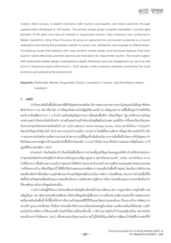 studies, field surveys, in-depth interviews with tourists and experts, and data collection through questionnaires distributed to 100 tourists. The primary sample group comprises Generation Y tourists aged between 25-44 years who have an interest in responsible tourism. Data collection was conducted in Rabam Subdistrict, Uthai Thani Province, focusing on exploring the community's potential as a tourist destination and testing the prototype website to assess user satisfaction and evaluate its effectiveness. The findings reveal that websites with clear content, simple design, and functional features that meet tourists' needs effectively promote learning and motivation for responsible tourism. The results suggest that multimedia website designs emphasizing in-depth information and user engagement can serve as vital tools in advancing responsible tourism. Such designs strike a balance between promoting the local economy and preserving the environment. Keywords: Multimedia Website, Responsible Tourism, Generation Y tourists, Huai Kha Khaeng, Rabam Subdistrict1. %u0e1a%u0e17%u0e19%u0e33 %u0e1b%uf705%u0e32%u0e2b%uf70b%u0e27%u0e22%u0e02%u0e32%u0e41%u0e02%uf70b%u0e07%u0e40%u0e1b%uf712%u0e19%u0e1e%u0e37%u0e49%u0e19%u0e17%u0e35%u0e48%u0e18%u0e23%u0e23%u0e21%u0e0a%u0e32%u0e15%u0e34%u0e17%u0e35%u0e48%u0e2a%u0e33%u0e04%u0e31%u0e0d%u0e02%u0e2d%u0e07%u0e1b%u0e23%u0e30%u0e40%u0e17%u0e28%u0e44%u0e17%u0e22 %u0e21%u0e35%u0e04%u0e27%u0e32%u0e21%u0e2b%u0e25%u0e32%u0e01%u0e2b%u0e25%u0e32%u0e22%u0e17%u0e32%u0e07%u0e23%u0e30%u0e1a%u0e1a%u0e19%u0e34%u0e40%u0e27%u0e28%u0e41%u0e25%u0e30%u0e40%u0e1b%uf712%u0e19%u0e17%u0e35%u0e48%u0e2d%u0e22%u0e39%uf70a%u0e2d%u0e32%u0e28%u0e31%u0e22%u0e02%u0e2d%u0e07%u0e2a%u0e31%u0e15%u0e27%uf70e%u0e1b%uf705%u0e32%u0e2b%u0e32%u0e22%u0e32%u0e01 %u0e23%u0e27%u0e21 582 %u0e0a%u0e19%u0e34%u0e14 %u0e42%u0e14%u0e22 15 %u0e0a%u0e19%u0e34%u0e14%u0e16%u0e39%u0e01%u0e08%u0e31%u0e14%u0e2a%u0e16%u0e32%u0e19%u0e30%u0e43%u0e01%u0e25%uf70b%u0e2a%u0e39%u0e0d%u0e1e%u0e31%u0e19%u0e18%u0e38%uf70e%u0e41%u0e25%u0e30%u0e2d%u0e35%u0e01 55 %u0e0a%u0e19%u0e34%u0e14%u0e16%u0e39%u0e01%u0e04%u0e38%u0e01%u0e04%u0e32%u0e21 %u0e41%u0e21%uf70b%u0e1e%u0e37%u0e49%u0e19%u0e17%u0e35%u0e48%u0e08%u0e30%u0e16%u0e39%u0e01%u0e01%u0e33%u0e2b%u0e19%u0e14%u0e43%u0e2b%uf70b%u0e40%u0e1b%uf712%u0e19%u0e40%u0e02%u0e15%u0e23%u0e31%u0e01%u0e29%u0e32%u0e1e%u0e31%u0e19%u0e18%u0e38%uf70e%u0e2a%u0e31%u0e15%u0e27%uf70e%u0e1b%uf705%u0e32%u0e01%u0e27%uf70a%u0e32 1.6 %u0e25%uf70b%u0e32%u0e19%u0e44%u0e23%uf70a%u0e41%u0e15%uf70a%u0e22%u0e31%u0e07%u0e40%u0e1c%u0e0a%u0e34%u0e0d%u0e1b%uf710%u0e0d%u0e2b%u0e32%u0e02%u0e32%u0e14%u0e01%u0e32%u0e23%u0e40%u0e0a%u0e37%u0e48%u0e2d%u0e21%u0e15%uf70a%u0e2d%u0e1e%u0e37%u0e49%u0e19%u0e17%u0e35%u0e48%u0e1b%uf705%u0e32 %u0e40%u0e1e%u0e37%u0e48%u0e2d%u0e41%u0e01%uf70b%u0e1b%uf710%u0e0d%u0e2b%u0e32 %u0e23%u0e31%u0e10%u0e1a%u0e32%u0e25%u0e44%u0e14%uf70b%u0e23%u0e27%u0e21%u0e1b%uf705%u0e32%u0e17%u0e38%uf70a%u0e07%u0e43%u0e2b%u0e0d%uf70a%u0e19%u0e40%u0e23%u0e28%u0e27%u0e23%u0e41%u0e25%u0e30%u0e1b%uf705%u0e32%u0e2b%uf70b%u0e27%u0e22%u0e02%u0e32%u0e41%u0e02%uf70b%u0e07%u0e40%u0e02%uf70b%u0e32%u0e14%uf70b%u0e27%u0e22%u0e01%u0e31%u0e19 %u0e01%u0e25%u0e32%u0e22%u0e40%u0e1b%uf712%u0e19%u0e40%u0e02%u0e15%u0e1b%uf705%u0e32%u0e2d%u0e19%u0e38%u0e23%u0e31%u0e01%u0e29%uf70e%u0e02%u0e19%u0e32%u0e14%u0e43%u0e2b%u0e0d%uf70a%u0e17%u0e35%u0e48%u0e2a%u0e38%u0e14%u0e43%u0e19%u0e1b%u0e23%u0e30%u0e40%u0e17%u0e28 %u0e41%u0e25%u0e30%u0e44%u0e14%uf70b%u0e23%u0e31%u0e1a%u0e01%u0e32%u0e23%u0e02%u0e36%u0e49%u0e19%u0e17%u0e30%u0e40%u0e1a%u0e35%u0e22%u0e19%u0e40%u0e1b%uf712%u0e19%u0e21%u0e23%u0e14%u0e01%u0e42%u0e25%u0e01%u0e17%u0e32%u0e07%u0e18%u0e23%u0e23%u0e21%u0e0a%u0e32%u0e15%u0e34%u0e41%u0e2b%uf70a%u0e07%u0e41%u0e23%u0e01%u0e02%u0e2d%u0e07%u0e44%u0e17%u0e22%u0e43%u0e19%u0e1b%uf702%u0e1e.%u0e28. 2534 (UNESCO World Heritage Centre, 2560) %u0e2d%u0e22%uf70a%u0e32%u0e07%u0e44%u0e23%u0e01%u0e47%u0e15%u0e32%u0e21 %u0e01%u0e32%u0e23%u0e1a%u0e38%u0e01%u0e23%u0e38%u0e01%u0e1b%uf705%u0e32%u0e22%u0e31%u0e07%u0e04%u0e07%u0e40%u0e1b%uf712%u0e19%u0e1b%uf710%u0e0d%u0e2b%u0e32%u0e2a%u0e33%u0e04%u0e31%u0e0d %u0e43%u0e19%u0e1b%uf7022565 %u0e1e%u0e1a%u0e01%u0e32%u0e23%u0e1a%u0e38%u0e01%u0e23%u0e38%u0e01%u0e1b%uf705%u0e32%u0e23%u0e27%u0e21%u0e40%u0e01%u0e37%u0e2d%u0e1a 20,000 %u0e44%u0e23%uf70a %u0e42%u0e14%u0e22%u0e21%u0e35%u0e17%u0e31%u0e49%u0e07%u0e04%u0e27%u0e32%u0e21%u0e15%uf70b%u0e2d%u0e07%u0e01%u0e32%u0e23%u0e17%u0e35%u0e48%u0e2d%u0e22%u0e39%uf70a%u0e2d%u0e32%u0e28%u0e31%u0e22 %u0e41%u0e2b%u0e25%uf70a%u0e07%u0e17%u0e33%u0e01%u0e34%u0e19 %u0e2b%u0e23%u0e37%u0e2d%u0e01%u0e32%u0e23%u0e41%u0e2a%u0e27%u0e07%u0e2b%u0e32%u0e1b%u0e23%u0e30%u0e42%u0e22%u0e0a%u0e19%uf70e%u0e08%u0e32%u0e01%u0e17%u0e23%u0e31%u0e1e%u0e22%u0e32%u0e01%u0e23%u0e18%u0e23%u0e23%u0e21%u0e0a%u0e32%u0e15%u0e34%u0e2a%u0e16%u0e32%u0e19%u0e01%u0e32%u0e23%u0e13%uf70e%u0e19%u0e35%u0e49%u0e22%u0e31%u0e07%u0e16%u0e39%u0e01%u0e0b%u0e49%u0e33%u0e40%u0e15%u0e34%u0e21%u0e14%uf70b%u0e27%u0e22%u0e19%u0e42%u0e22%u0e1a%u0e32%u0e22%u0e01%u0e32%u0e23%u0e40%u0e1e%u0e34%u0e48%u0e21%u0e1e%u0e37%u0e49%u0e19%u0e17%u0e35%u0e48%u0e1b%uf705%u0e32%u0e42%u0e14%u0e22%u0e01%u0e32%u0e23%u0e02%u0e31%u0e1a%u0e44%u0e25%uf70a%u0e0a%u0e38%u0e21%u0e0a%u0e19 %u0e17%u0e33%u0e43%u0e2b%uf70b%u0e40%u0e01%u0e34%u0e14%u0e1c%u0e25%u0e01%u0e23%u0e30%u0e17%u0e1a%u0e15%uf70a%u0e2d%u0e1c%u0e39%uf70b%u0e22%u0e32%u0e01%u0e44%u0e23%uf70b%u0e02%u0e13%u0e30%u0e40%u0e14%u0e35%u0e22%u0e27%u0e01%u0e31%u0e19%u0e1e%u0e37%u0e49%u0e19%u0e17%u0e35%u0e48%u0e1b%uf705%u0e32%u0e01%u0e47%u0e25%u0e14%u0e25%u0e07%u0e16%u0e36%u0e07 317,819 %u0e44%u0e23%uf70a%u0e43%u0e19%u0e1b%uf7022566 %u0e0b%u0e36%u0e48%u0e07%u0e40%u0e1b%uf712%u0e19%u0e01%u0e32%u0e23%u0e25%u0e14%u0e25%u0e07%u0e21%u0e32%u0e01%u0e17%u0e35%u0e48%u0e2a%u0e38%u0e14%u0e43%u0e19%u0e23%u0e2d%u0e1a 10 %u0e1b%uf702(%u0e21%u0e39%u0e25%u0e19%u0e34%u0e18%u0e34%u0e2a%u0e37%u0e1a%u0e19%u0e32%u0e04%u0e30%u0e40%u0e2a%u0e16%u0e35%u0e22%u0e23, 2567) %u0e15%u0e33%u0e1a%u0e25%u0e23%u0e30%u0e1a%u0e33 %u0e08%u0
