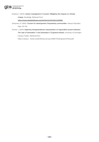 G%u00f6ssling, S. (2010). Carbon management in tourism: Mitigating the impacts on climate change. Routledge. Retrieved From https://www.cabidigitallibrary.org/doi/full/10.5555/20113234480Scheyvens, R. (2002). Tourism for development: Empowering communities. Pearson Education. Page 125-132. Timm%u00e9, C. (2023). Exploring intergenerational characteristics of responsible tourism behavior: The case of Generation Y and Generation Z (Capstone thesis). University of Groningen, Campus Frysl%u00e2n. Retrieved from https://campus- fryslan.studenttheses.ub.rug.nl/284/1/FinalCapstoneThesis.pdf- 144 -