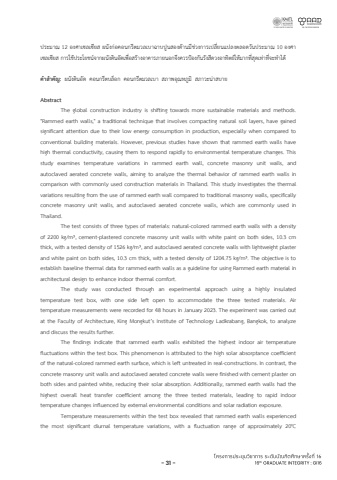 %u0e1b%u0e23%u0e30%u0e21%u0e32%u0e13 12 %u0e2d%u0e07%u0e28%u0e32%u0e40%u0e0b%u0e25%u0e40%u0e0b%u0e35%u0e22%u0e2a %u0e1c%u0e19%u0e31%u0e07%u0e01%uf70a%u0e2d%u0e04%u0e2d%u0e19%u0e01%u0e23%u0e35%u0e15%u0e21%u0e27%u0e25%u0e40%u0e1a%u0e32%u0e09%u0e32%u0e1a%u0e1b%u0e39%u0e19%u0e2a%u0e2d%u0e07%u0e14%uf70b%u0e32%u0e19%u0e21%u0e35%u0e0a%uf70a%u0e27%u0e07%u0e01%u0e32%u0e23%u0e40%u0e1b%u0e25%u0e35%u0e48%u0e22%u0e19%u0e41%u0e1b%u0e25%u0e07%u0e15%u0e25%u0e2d%u0e14%u0e27%u0e31%u0e19%u0e1b%u0e23%u0e30%u0e21%u0e32%u0e13 10 %u0e2d%u0e07%u0e28%u0e32%u0e40%u0e0b%u0e25%u0e40%u0e0b%u0e35%u0e22%u0e2a %u0e01%u0e32%u0e23%u0e43%u0e0a%uf70b%u0e1b%u0e23%u0e30%u0e42%u0e22%u0e0a%u0e19%uf70e%u0e08%u0e32%u0e01%u0e1c%u0e19%u0e31%u0e07%u0e14%u0e34%u0e19%u0e2d%u0e31%u0e14%u0e40%u0e1e%u0e37%u0e48%u0e2d%u0e2a%u0e23%uf70b%u0e32%u0e07%u0e2d%u0e32%u0e04%u0e32%u0e23%u0e20%u0e32%u0e22%u0e19%u0e2d%u0e01%u0e08%u0e36%u0e07%u0e04%u0e27%u0e23%u0e1b%uf706%u0e2d%u0e07%u0e01%u0e31%u0e19%u0e23%u0e31%u0e07%u0e2a%u0e35%u0e14%u0e27%u0e07%u0e2d%u0e32%u0e17%u0e34%u0e15%u0e22%uf70e%u0e43%u0e2b%uf70b%u0e21%u0e32%u0e01%u0e17%u0e35%u0e48%u0e2a%u0e38%u0e14%u0e40%u0e17%uf70a%u0e32%u0e17%u0e35%u0e48%u0e08%u0e30%u0e17%u0e33%u0e44%u0e14%uf70b%u0e04%u0e33%u0e2a%u0e33%u0e04%u0e31%u0e0d: %u0e1c%u0e19%u0e31%u0e07%u0e14%u0e34%u0e19%u0e2d%u0e31%u0e14 %u0e04%u0e2d%u0e19%u0e01%u0e23%u0e35%u0e15%u0e1a%u0e25%u0e47%u0e2d%u0e01 %u0e04%u0e2d%u0e19%u0e01%u0e23%u0e35%u0e15%u0e21%u0e27%u0e25%u0e40%u0e1a%u0e32 %u0e2a%u0e20%u0e32%u0e1e%u0e2d%u0e38%u0e13%u0e2b%u0e20%u0e39%u0e21%u0e34 %u0e2a%u0e20%u0e32%u0e27%u0e30%u0e19%uf70a%u0e32%u0e2a%u0e1a%u0e32%u0e22Abstract The global construction industry is shifting towards more sustainable materials and methods. \ earth walls,\significant attention due to their low energy consumption in production, especially when compared to conventional building materials. However, previous studies have shown that rammed earth walls have high thermal conductivity, causing them to respond rapidly to environmental temperature changes. This study examines temperature variations in rammed earth wall, concrete masonry unit walls, and autoclaved aerated concrete walls, aiming to analyze the thermal behavior of rammed earth walls in comparison with commonly used construction materials in Thailand. This study investigates the thermal variations resulting from the use of rammed earth wall compared to traditional masonry walls, specifically concrete masonry unit walls, and autoclaved aerated concrete walls, which are commonly used in Thailand. The test consists of three types of materials: natural-colored rammed earth walls with a density of 2200 kg/m%u00b3, cement-plastered concrete masonry unit walls with white paint on both sides, 10.3 cm thick, with a tested density of 1526 kg/m%u00b3, and autoclaved aerated concrete walls with lightweight plaster and white paint on both sides, 10.3 cm thick, with a tested density of 1204.75 kg/m%u00b3. The objective is to establish baseline thermal data for rammed earth walls as a guideline for using Rammed earth material in architectural design to enhance indoor thermal comfort. The study was conducted through an experimental approach using a highly insulated temperature test box, with one side left open to accommodate the three tested materials. Air temperature measurements were recorded for 48 hours in January 2023. The experiment was carried out at the Faculty of Architecture, King Mongkut%u2019s Institute of Technology Ladkrabang, Bangkok, to analyze and discuss the results further. The findings indicate that rammed earth walls exhibited the highest indoor air temperature fluctuations within the test box. This phenomenon is attributed to the high solar absorptance coefficient of the natural-colored rammed earth surface, which is left untreated in real-constructions. In contrast, the concrete masonry unit walls and autoclaved aerated concrete walls were finished with cement plaster on both sides and painted white, reducing their solar absorption. Additionally, rammed earth walls had the highest overall heat transfer coefficient among the three tested materials, leading to rapid indoor temperature changes influenced by external environmental conditions and solar radiation exposure. Temperature measurements within the test box revealed that rammed earth walls experienced the most significant diurnal temperature variations, with a fluctuation range of approximately 20%u00b0C - 31 -