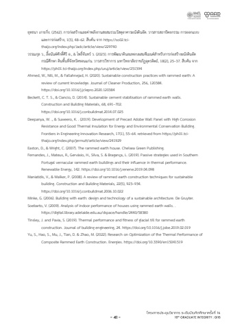 %u0e22%u0e38%u0e17%u0e18%u0e19%u0e32 %u0e40%u0e01%u0e32%u0e30%u0e01%u0e34%u0e48%u0e07. (2562). %u0e01%u0e32%u0e23%u0e01%uf70a%u0e2d%u0e2a%u0e23%uf70b%u0e32%u0e07%u0e41%u0e25%u0e30%u0e04%uf70a%u0e32%u0e1e%u0e25%u0e31%u0e07%u0e07%u0e32%u0e19%u0e2a%u0e30%u0e2a%u0e21%u0e23%u0e27%u0e21%u0e27%u0e2a%u0e14%u0e31%u0e38%u0e2d%u0e32%u0e04%u0e32%u0e23%u0e1c%u0e19%u0e31%u0e07%u0e14%u0e34%u0e19%u0e2d%u0e31%u0e14. %u0e27%u0e32%u0e23%u0e2a%u0e32%u0e23%u0e2a%u0e16%u0e32%u0e1b%u0e15%u0e22%u0e01%u0e23%u0e23%u0e21%uf710%u0e01%u0e32%u0e23%u0e2d%u0e2d%u0e01%u0e41%u0e1a%u0e1a%u0e41%u0e25%u0e30%u0e01%u0e32%u0e23%u0e01%uf70a%u0e2d%u0e2a%u0e23%uf70b%u0e32%u0e07, 1(3), 48%u201362. %u0e2a%u0e37%u0e1a%u0e04%uf70b%u0e19 %u0e08%u0e32%u0e01 https://so02.tcithaijo.org/index.php/Jadc/article/view/229740%u0e27%u0e23%u0e23%u0e13%u0e01%u0e38%u0e25 %u0e27., %u0e25%u0e35%u0e49%u0e2d%u0e19%u0e31%u0e19%u0e15%uf70e%u0e28%u0e31%u0e01%u0e14%u0e34%u0e4c%u0e28%u0e34%u0e23%u0e34%u0e2d., & %u0e42%u0e1e%u0e18%u0e34%u0e4c%u0e08%u0e31%u0e19%u0e17%u0e23%uf70e%u0e27. (2023). %u0e01%u0e32%u0e23%u0e1e%u0e31%u0e12%u0e19%u0e32%u0e14%u0e34%u0e19%u0e25%u0e21%u0e2b%u0e2d%u0e1a%u0e1c%u0e2a%u0e21%u0e0b%u0e35%u0e40%u0e21%u0e19%u0e15%u0e2a%u0e33%u0e2b%u0e23 %uf70e %u0e31%u0e1a%u0e01%u0e32%u0e23%u0e01%uf70a%u0e2d%u0e2a%u0e23%uf70b%u0e32%u0e07%u0e1c%u0e19%u0e31%u0e07%u0e14%u0e34%u0e19%u0e2d%u0e31%u0e14%u0e01%u0e23%u0e13%u0e35%u0e28%u0e36%u0e01%u0e29%u0e32 %u0e14%u0e34%u0e19%u0e1e%u0e37%u0e49%u0e19%u0e17%u0e35%u0e48%u0e08%u0e31%u0e07%u0e2b%u0e27%u0e31%u0e14%u0e02%u0e2d%u0e19%u0e41%u0e01%uf70a%u0e19. %u0e27%u0e32%u0e23%u0e2a%u0e32%u0e23%u0e27%u0e34%u0e0a%u0e32%u0e01%u0e32%u0e23 %u0e21%u0e2b%u0e32%u0e27%u0e34%u0e17%u0e22%u0e32%u0e25%u0e31%u0e22%u0e23%u0e32%u0e0a%u0e20%u0e31%u0e0f%u0e2d%u0e15%u0e23%u0e14%u0e38%u0e34%u0e15%u0e16%uf70e, 18(2), 25%u201337. %u0e2a%u0e37%u0e1a%u0e04%uf70b%u0e19 %u0e08%u0e32%u0e01https://ph01.tci-thaijo.org/index.php/uruj/article/view/251394Ahmed, W., Nili, M., & Fallahnejad, H. (2020). Sustainable construction practices with rammed earth: A review of current knowledge. Journal of Cleaner Production, 256, 120384. https://doi.org/10.1016/j.jclepro.2020.120384Beckett, C. T. S., & Ciancio, D. (2014). Sustainable cement stabilisation of rammed earth walls. Construction and Building Materials, 68, 691%u2013702. https://doi.org/10.1016/j.conbuildmat.2014.07.025Deepanya, W. ., & Suweero, K. . (2019). Development of Precast Adobe Wall Panel with High Corrosion Resistance and Good Thermal Insulation for Energy and Environmental Conservation Building. Frontiers in Engineering Innovation Research, 17(1), 55%u201364. retrieved from https://ph01.tcithaijo.org/index.php/jermutt/article/view/241929Easton, D., & Wright, C. (2007). The rammed earth house. Chelsea Green Publishing. Fernandes, J., Mateus, R., Gerv%u00e1sio, H., Silva, S. & Bragan%u00e7a, L. (2019). Passive strategies used in Southern Portugal vernacular rammed earth buildings and their influence in thermal performance. Renewable Energy, 142. https://doi.org/10.1016/j.renene.2019.04.098Maniatidis, V., & Walker, P. (2008). A review of rammed earth construction techniques for sustainable building. Construction and Building Materials, 22(5), 923%u2013934. https://doi.org/10.1016/j.conbuildmat.2006.10.022Minke, G. (2006). Building with earth: design and technology of a sustainable architecture. De Gruyter. Soebarto, V. (2009). Analysis of indoor performance of houses using rammed earth walls. . https://digital.library.adelaide.edu.au/dspace/handle/2440/58380Tinsley, J. and Pavia, S. (2019). Thermal performance and fitness of glacial till for rammed earth construction. Journal of building engineering, 24. https://doi.org/10.1016/j.jobe.2019.02.019Yu, S., Hao, S., Mu, J., Tian, D. & Zhao, M. (2022). Research on Optimization of the Thermal Performance of Composite Rammed Earth Construction. Energies. https://doi.org/10.3390/en15041519- 41 -