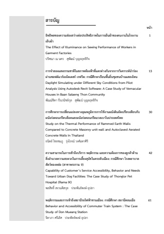 %u0e2a%u0e32%u0e23%u0e1a%u0e31%u0e0d %u0e2b%u0e19%u0e49%u0e32%u0e2d%u0e34%u0e17%u0e18%u0e34%u0e1e%u0e25%u0e02%u0e2d%u0e07%u0e04%u0e27%u0e32%u0e21%u0e2a%u0e48%u0e2d%u0e07%u0e2a%u0e27%u0e48%u0e32%u0e07%u0e15%u0e48%u0e2d%u0e1b%u0e23%u0e30%u0e2a%u0e34%u0e17%u0e18%u0e34%u0e20%u0e32%u0e1e%u0e43%u0e19%u0e01%u0e32%u0e23%u0e40%u0e22%u0e47%u0e19%u0e1c%u0e49%u0e32%u0e02%u0e2d%u0e07%u0e04%u0e19%u0e07%u0e32%u0e19%u0e43%u0e19%u0e42%u0e23%u0e07%u0e07%u0e32%u0e19 1%u0e40%u0e22%u0e47%u0e1a%u0e1c%u0e49%u0e32 The Effect of Illuminance on Sewing Performance of Workers in Garment Factories%u0e1b%u0e23%u0e34%u0e28%u0e13%u0e32 %u0e13 %u0e19%u0e04%u0e23 %u0e2a%u0e38%u0e1e%u0e31%u0e12%u0e19%u0e4c %u0e1a%u0e38%u0e0d%u0e22%u0e24%u0e17%u0e18%u0e34%u0e01%u0e34%u0e08 %u0e01%u0e32%u0e23%u0e08%u0e33%u0e25%u0e2d%u0e07%u0e41%u0e2a%u0e07%u0e18%u0e23%u0e23%u0e21%u0e0a%u0e32%u0e15%u0e34%u0e43%u0e19%u0e2a%u0e20%u0e32%u0e1e%u0e17%u0e49%u0e2d%u0e07%u0e1f%u0e49%u0e32%u0e17%u0e35%u0e48%u0e41%u0e15%u0e01%u0e15%u0e48%u0e32%u0e07%u0e01%u0e31%u0e19%u0e08%u0e32%u0e01%u0e01%u0e32%u0e23%u0e27%u0e34%u0e40%u0e04%u0e23%u0e32%u0e30%u0e2b%u0e4c%u0e19%u0e33%u0e23%u0e48%u0e2d%u0e07 13%u0e1c%u0e48%u0e32%u0e19%u0e0b%u0e2d%u0e1f%u0e15%u0e4c%u0e41%u0e27%u0e23%u0e4c%u0e2d%u0e2d%u0e42%u0e15%u0e40%u0e14%u0e2a%u0e01%u0e4c %u0e40%u0e23%u0e1f%u0e27%u0e34%u0e15: %u0e01%u0e23%u0e13%u0e35%u0e28%u0e36%u0e01%u0e29%u0e32%u0e40%u0e23%u0e37%u0e2d%u0e19%u0e1e%u0e37%u0e49%u0e19%u0e16%u0e34%u0e48%u0e19%u0e0a%u0e38%u0e21%u0e0a%u0e19%u0e1a%u0e49%u0e32%u0e19%u0e41%u0e2a%u0e25%u0e07%u0e42%u0e17%u0e19Daylight Simulating under Different Sky Conditions from Pilot Analysis Using Autodesk Revit Software: A Case Study of Vernacular Houses in Baan Salaeng Thon Community%u0e1e%u0e31%u0e13%u0e13%u0e4c%u0e0a%u0e34%u0e15%u0e32 %u0e1b%u0e34%u0e48%u0e19%u0e27%u0e19%u0e34%u0e0a%u0e22%u0e4c%u0e01%u0e38%u0e25 %u0e2a%u0e38%u0e1e%u0e31%u0e12%u0e19%u0e4c %u0e1a%u0e38%u0e0d%u0e22%u0e24%u0e17%u0e18%u0e34%u0e01%u0e34%u0e08%u0e01%u0e32%u0e23%u0e28%u0e36%u0e01%u0e29%u0e32%u0e01%u0e32%u0e23%u0e40%u0e1b%u0e25%u0e35%u0e48%u0e22%u0e19%u0e41%u0e1b%u0e25%u0e07%u0e17%u0e32%u0e07%u0e2d%u0e38%u0e13%u0e2b%u0e20%u0e39%u0e21%u0e34%u0e08%u0e32%u0e01%u0e01%u0e32%u0e23%u0e43%u0e0a%u0e49%u0e07%u0e32%u0e19%u0e1c%u0e19%u0e31%u0e07%u0e14%u0e34%u0e19%u0e2d%u0e31%u0e14%u0e40%u0e1b%u0e23%u0e35%u0e22%u0e1a%u0e40%u0e17%u0e35%u0e22%u0e1a%u0e01%u0e31%u0e1a 30%u0e1c%u0e19%u0e31%u0e07%u0e01%u0e48%u0e2d%u0e04%u0e2d%u0e19%u0e01%u0e23%u0e35%u0e15%u0e1a%u0e25%u0e47%u0e2d%u0e04%u0e41%u0e25%u0e30%u0e1c%u0e19%u0e31%u0e07%u0e01%u0e48%u0e2d%u0e04%u0e2d%u0e19%u0e01%u0e23%u0e35%u0e15%u0e21%u0e27%u0e25%u0e40%u0e1a%u0e32%u0e43%u0e19%u0e1b%u0e23%u0e30%u0e40%u0e17%u0e28%u0e44%u0e17%u0e22Study on the Thermal Performance of Rammed Earth Walls Compared to Concrete Masonry unit wall and Autoclaved Aerated Concrete Walls In Thailand%u0e18%u0e19%u0e34%u0e15%u0e22%u0e4c %u0e44%u0e0a%u0e22%u0e0a%u0e21%u0e20%u0e39 %u0e23%u0e38%u0e48%u0e07%u0e42%u0e23%u0e08%u0e19%u0e4c %u0e27%u0e07%u0e28%u0e4c%u0e21%u0e2b%u0e32%u0e28%u0e34%u0e23%u0e34%u0e04%u0e27%u0e32%u0e21%u0e2a%u0e32%u0e21%u0e32%u0e23%u0e16%u0e43%u0e19%u0e01%u0e32%u0e23%u0e40%u0e02%u0e49%u0e32%u0e16%u0e36%u0e07%u0e1a%u0e23%u0e34%u0e01%u0e32%u0e23 %u0e1e%u0e24%u0e15%u0e34%u0e01%u0e23%u0e23%u0e21 %u0e41%u0e25%u0e30%u0e04%u0e27%u0e32%u0e21%u0e15%u0e49%u0e2d%u0e07%u0e01%u0e32%u0e23%u0e02%u0e2d%u0e07%u0e25%u0e39%u0e01%u0e04%u0e49%u0e32%u0e14%u0e49%u0e32%u0e19 42%u0e2a%u0e34%u0e48%u0e07%u0e2d%u0e33%u0e19%u0e27%u0e22%u0e04%u0e27%u0e32%u0e21%u0e2a%u0e30%u0e14%u0e27%u0e01%u0e43%u0e19%u0e01%u0e32%u0e23%u0e40%u0e25%u0e35%u0e49%u0e22%u0e07%u0e2a%u0e38%u0e19%u0e31%u0e02%u0e43%u0e19%u0e04%u0e23%u0e30%u0e14%u0e31%u0e1a%u0e40%u0e21%u0e37%u0e2d%u0e07: %u0e01%u0e23%u0e13%u0e35%u0e28%u0e36%u0e01%u0e29%u0e32 %u0e42%u0e23%u0e07%u0e1e%u0e22%u0e32%u0e1a%u0e32%u0e25%u0e2a%u0e31%u0e15%u0e27%u0e4c%u0e17%u0e2d%u0e07%u0e2b%u0e25%u0e48%u0e2d (%u0e2a%u0e32%u0e02%u0e32%u0e1e%u0e23%u0e30%u0e23%u0e32%u0e21 9)Capability of Customer%u2019s Service Accessibility, Behavior and NeedsToward Urban Dog Facilities: The Case Study of Thonglor Pet Hospital (Rama IX)%u0e1e%u0e25%u0e2a%u0e34%u0e17%u0e18%u0e34%u0e4c %u0e2a%u0e07%u0e27%u0e19%u0e14%u0e34%u0e2a%u0e01%u0e38%u0e25 %u0e1b%u0e23%u0e30%u0e1e%u0e31%u0e19%u0e18%u0e4c%u0e1e%u0e07%u0e29%u0e4c %u0e2d%u0e38%u0e1b%u0e25%u0e32%u0e1e%u0e24%u0e15%u0e34%u0e01%u0e23%u0e23%u0e21%u0e41%u0e25%u0e30%u0e01%u0e32%u0e23%u0e40%u0e02%u0e49%u0e32%u0e16%u0e36%u0e07%u0e2a%u0e16%u0e32%u0e19%u0e35%u0e23%u0e16%u0e44%u0e1f%u0e1f%u0e49%u0e32%u0e0a%u0e32%u0e19%u0e40%u0e21%u0e37%u0e2d%u0e07: %u0e01%u0e23%u0e13%u0e35%u0e28%u0e36%u0e01%u0e29%u0e32 %u0e2a%u0e16%u0e32%u0e19%u0e35%u0e14%u0e2d%u0e19%u0e40%u0e21%u0e37%u0e2d 61 Behavior and Accessibility of Commuter Train System : The Case Study of Don Mueang Station%u0e08%u0e34%u0e14%u0e32%u0e20%u0e32 %u0e28%u0e23%u0e35%u0e40%u0e25%u0e34%u0e28 %u0e1b%u0e23%u0e30%u0e1e%u0e31%u0e17%u0e18%u0e4c%u0e1e%u0e07%u0e29%u0e4c %u0e2d%u0e38%u0e1b%u0e25%u0e32