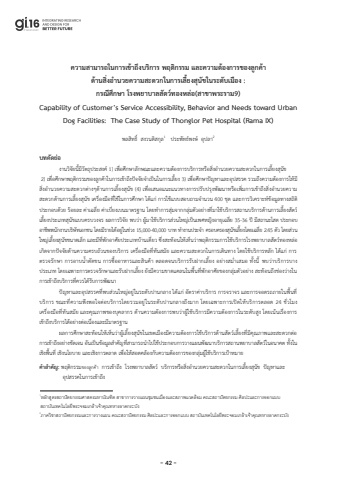 %u0e04%u0e27%u0e32%u0e21%u0e2a%u0e32%u0e21%u0e32%u0e23%u0e16%u0e43%u0e19%u0e01%u0e32%u0e23%u0e40%u0e02%uf70b%u0e32%u0e16%u0e36%u0e07%u0e1a%u0e23%u0e34%u0e01%u0e32%u0e23 %u0e1e%u0e24%u0e15%u0e34%u0e01%u0e23%u0e23%u0e21 %u0e41%u0e25%u0e30%u0e04%u0e27%u0e32%u0e21%u0e15%uf70b%u0e2d%u0e07%u0e01%u0e32%u0e23%u0e02%u0e2d%u0e07%u0e25%u0e39%u0e01%u0e04%uf70b%u0e32%u0e14%uf70b%u0e32%u0e19%u0e2a%u0e34%u0e48%u0e07%u0e2d%u0e33%u0e19%u0e27%u0e22%u0e04%u0e27%u0e32%u0e21%u0e2a%u0e30%u0e14%u0e27%u0e01%u0e43%u0e19%u0e01%u0e32%u0e23%u0e40%u0e25%u0e35%u0e49%u0e22%u0e07%u0e2a%u0e38%u0e19%u0e31%u0e02%u0e43%u0e19%u0e23%u0e30%u0e14%u0e31%u0e1a%u0e40%u0e21%u0e37%u0e2d%u0e07 :%u0e01%u0e23%u0e13%u0e35%u0e28%u0e36%u0e01%u0e29%u0e32 %u0e42%u0e23%u0e07%u0e1e%u0e22%u0e32%u0e1a%u0e32%u0e25%u0e2a%u0e31%u0e15%u0e27%uf70e%u0e17%u0e2d%u0e07%u0e2b%u0e25%uf70a%u0e2d(%u0e2a%u0e32%u0e02%u0e32%u0e1e%u0e23%u0e30%u0e23%u0e32%u0e219) Capability of Customer%u2019s Service Accessibility, Behavior and Needs toward Urban Dog Facilities: The Case Study of Thonglor Pet Hospital (Rama IX) %u0e1e%u0e25%u0e2a%u0e34%u0e17%u0e18%u0e34%u0e4c %u0e2a%u0e07%u0e27%u0e19%u0e14%u0e34%u0e2a%u0e01%u0e38%u0e251 %u0e1b%u0e23%u0e30%u0e1e%u0e31%u0e17%u0e18%uf70e%u0e1e%u0e07%u0e29%uf70e %u0e2d%u0e38%u0e1b%u0e25%u0e322%u0e1a%u0e17%u0e04%u0e31%u0e14%u0e22%uf70a%u0e2d %u0e07%u0e32%u0e19%u0e27%u0e34%u0e08%u0e31%u0e22%u0e19%u0e35%u0e49%u0e21%u0e35%u0e27%u0e31%u0e15%u0e16%u0e38%u0e1b%u0e23%u0e30%u0e2a%u0e07%u0e04%uf70e 1) %u0e40%u0e1e%u0e37%u0e48%u0e2d%u0e28%u0e36%u0e01%u0e29%u0e32%u0e25%u0e31%u0e01%u0e29%u0e13%u0e30%u0e41%u0e25%u0e30%u0e04%u0e27%u0e32%u0e21%u0e15%uf70b%u0e2d%u0e07%u0e01%u0e32%u0e23%u0e1a%u0e23%u0e34%u0e01%u0e32%u0e23%u0e2b%u0e23%u0e37%u0e2d%u0e2a%u0e34%u0e48%u0e07%u0e2d%u0e33%u0e19%u0e27%u0e22%u0e04%u0e27%u0e32%u0e21%u0e2a%u0e30%u0e14%u0e27%u0e01%u0e43%u0e19%u0e01%u0e32%u0e23%u0e40%u0e25%u0e35%u0e49%u0e22%u0e07%u0e2a%u0e38%u0e19%u0e31%u0e02 2) %u0e40%u0e1e%u0e37%u0e48%u0e2d%u0e28%u0e36%u0e01%u0e29%u0e32%u0e1e%u0e24%u0e15%u0e34%u0e01%u0e23%u0e23%u0e21%u0e02%u0e2d%u0e07%u0e25%u0e39%u0e01%u0e04%uf70b%u0e32%u0e43%u0e19%u0e01%u0e32%u0e23%u0e40%u0e02%uf70b%u0e32%u0e16%u0e36%u0e07%u0e1b%uf710%u0e08%u0e08%u0e31%u0e22%u0e08%u0e33%u0e40%u0e1b%uf712%u0e19%u0e43%u0e19%u0e01%u0e32%u0e23%u0e40%u0e25%u0e35%u0e49%u0e22%u0e07 3) %u0e40%u0e1e%u0e37%u0e48%u0e2d%u0e28%u0e36%u0e01%u0e29%u0e32%u0e1b%uf710%u0e0d%u0e2b%u0e32%u0e41%u0e25%u0e30%u0e2d%u0e38%u0e1b%u0e2a%u0e23%u0e23%u0e04 %u0e23%u0e27%u0e21%u0e16%u0e36%u0e07%u0e04%u0e27%u0e32%u0e21%u0e15%uf70b%u0e2d%u0e07%u0e01%u0e32%u0e23%u0e43%u0e2b%uf70b%u0e21%u0e35%u0e2a%u0e34%u0e48%u0e07%u0e2d%u0e33%u0e19%u0e27%u0e22%u0e04%u0e27%u0e32%u0e21%u0e2a%u0e30%u0e14%u0e27%u0e01%u0e15%uf70a%u0e32%u0e07%u0e46%u0e14%uf70b%u0e32%u0e19%u0e01%u0e32%u0e23%u0e40%u0e25%u0e35%u0e49%u0e22%u0e07%u0e2a%u0e38%u0e19%u0e31%u0e02 (4) %u0e40%u0e1e%u0e37%u0e48%u0e2d%u0e40%u0e2a%u0e19%u0e2d%u0e41%u0e19%u0e30%u0e41%u0e19%u0e27%u0e17%u0e32%u0e07%u0e01%u0e32%u0e23%u0e1b%u0e23%u0e31%u0e1a%u0e1b%u0e23%u0e38%u0e07%u0e1e%u0e31%u0e12%u0e19%u0e32%u0e2b%u0e23%u0e37%u0e2d%u0e40%u0e1e%u0e34%u0e48%u0e21%u0e01%u0e32%u0e23%u0e40%u0e02%uf70b%u0e32%u0e16%u0e36%u0e07%u0e2a%u0e34%u0e48%u0e07%u0e2d%u0e33%u0e19%u0e27%u0e22%u0e04%u0e27%u0e32%u0e21%u0e2a%u0e30%u0e14%u0e27%u0e01%u0e14%uf70b%u0e32%u0e19%u0e01%u0e32%u0e23%u0e40%u0e25%u0e35%u0e49%u0e22%u0e07%u0e2a%u0e38%u0e19%u0e31%u0e02 %u0e40%u0e04%u0e23%u0e37%u0e48%u0e2d%u0e07%u0e21%u0e37%u0e2d%u0e17%u0e35%u0e48%u0e43%u0e0a%uf70b%u0e43%u0e19%u0e01%u0e32%u0e23%u0e28%u0e36%u0e01%u0e29%u0e32 %u0e44%u0e14%uf70b%u0e41%u0e01%uf70a%u0e01%u0e32%u0e23%u0e43%u0e0a%uf70b%u0e41%u0e1a%u0e1a%u0e2a%u0e2d%u0e1a%u0e16%u0e32%u0e21%u0e08%u0e33%u0e19%u0e27%u0e19 400 %u0e0a%u0e38%u0e14 %u0e41%u0e25%u0e30%u0e01%u0e32%u0e23%u0e27%u0e34%u0e40%u0e04%u0e23%u0e32%u0e30%u0e2b%uf70e%u0e02%uf70b%u0e2d%u0e21%u0e39%u0e25%u0e17%u0e32%u0e07%u0e2a%u0e16%u0e34%u0e15%u0e34%u0e1b%u0e23%u0e30%u0e01%u0e2d%u0e1a%u0e14%uf70b%u0e27%u0e22 %u0e23%uf70b%u0e2d%u0e22%u0e25%u0e30%u0e04%uf70a%u0e32%u0e40%u0e09%u0e25%u0e35%u0e48%u0e22 %u0e04%uf70a%u0e32%u0e40%u0e1a%u0e35%u0e48%u0e22%u0e07%u0e40%u0e1a%u0e19%u0e21%u0e32%u0e15%u0e23%u0e10%u0e32%u0e19 %u0e42%u0e14%u0e22%u0e17%u0e33%u0e01%u0e32%u0e23%u0e2a%u0e38%uf70a%u0e21%u0e08%u0e32%u0e01%u0e01%u0e25%u0e38%uf70a%u0e21%u0e15%u0e31%u0e27%u0e2d%u0e22%uf70a%u0e32%u0e07%u0e17%u0e35%u0e48%u0e21%u0e32%u0e43%u0e0a%uf70b%u0e1a%u0e23%u0e34%u0e01%u0e32%u0e23%u0e2a%u0e16%u0e32%u0e19%u0e1a%u0e23%u0e34%u0e01%u0e32%u0e23%u0e14%uf70b%u0e32%u0e19%u0e01%u0e32%u0e23%u0e40%u0e25%u0e35%u0e49%u0e22%u0e07%u0e2a%u0e31%u0e15%u0e27%uf70e%u0e40%u0e25%u0e35%u0e49%u0e22%u0e07%u0e1b%u0e23%u0e30%u0e40%u0e20%u0e17%u0e2a%u0e38%u0e19%u0e31%u0e02%u0e41%u0e1a%u0e1a%u0e04%u0e23%u0e1a%u0e27%u0e07%u0e08%u0e23 %u0e1c%u0e25%u0e01%u0e32%u0e23%u0e27%u0e34%u0e08%u0e31%u0e22 %u0e1e%u0e1a%u0e27%uf70a%u0e32 %u0e1c%u0e39%uf70b%u0e21%u0e32%u0e43%u0e0a%uf70b%u0e1a%u0e23%u0e34%u0e01%u0e32%u0e23%u0e2a%uf70a%u0e27%u0e19%u0e43%u0e2b%u0e0d%uf70a%u0e40%u0e1b%uf712%u0e19%u0e40%u0e1e%u0e28%u0e2b%u0e0d%u0e34%u0e07%u0e2d%u0e32%u0e22%u0e38%u0e40%u0e09%u0e25%u0e35%u0e48%u0e22 35-36 %u0e1b%uf702%u0e21%u0e35%u0e2a%u0e16%u0e32%u0e19%u0e30%u0e42%u0e2a%u0e14 %u0e1b%u0e23%u0e30%u0e01%u0e2d%u0e1a%u0e2d%u0e32%u0e0a%u0e35%u0e1e%u0e1e%u0e19%u0e31%u0e01%u0e07%u0e32%u0e19%u0e1a%u0e23%u0e34%u0e29%u0e31%u0e17%u0e40%u0e2d%u0e01%u0e0a%u0e19 %u0e42%u0e14%u0e22%u0e21%u0e35%u0e23%u0e32%u0e22%u0e44%u0e14%uf70b%u0e2d%u0e22%u0e39%uf70a%u0e43%u0e19%u0e0a%uf70a%u0e27%u0e07 15,000-40,000 %u0e1a%u0e32%u0e17 %u0e17%u0e33%u0e07%u0e32%u0e19%u0e1b%u0e23%u0e30%u0e08%u0e33 %u0e04%u0e23%u0e2d%u0e1a%u0e04%u0e23%u0e2d%u0e07%u0e2a%u0e38%u0e19%u0e31%u0e02%u0e40%u0e25%u0e35%u0e49%u0e22%u0e07%u0e42%u0e14%u0e22%u0e40%u0e09%u0e25%u0e35%u0e48%u0e22 2.45 %u0e15%u0e31%u0e27 %u0e42%u0e14%u0e22%u0e2a%uf70a%u0e27%u0e19%u0e43%u0e2b%u0e0d%uf70a%u0e40%u0e25%u0e35%u0e49%u0e22%u0e07%u0e2a%u0e38%u0e19%u0e31%u0e02%u0e02%u0e19%u0e32%u0e14%u0e40%u0e25%u0e47%u0e01%u0e41%u0e25%u0e30%u0e21%u0e35%u0e17%u0e35%u0e48%u0e1e%u0e31%u0e01%u0e2d%u0