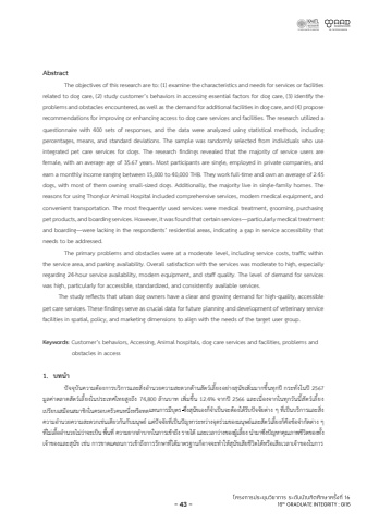 Abstract The objectives of this research are to: (1) examine the characteristics and needs for services or facilities related to dog care, (2) study customer%u2019s behaviors in accessing essential factors for dog care, (3) identify the problems and obstacles encountered, as well as the demand for additional facilities in dog care, and (4) propose recommendations for improving or enhancing access to dog care services and facilities. The research utilized a questionnaire with 400 sets of responses, and the data were analyzed using statistical methods, including percentages, means, and standard deviations. The sample was randomly selected from individuals who use integrated pet care services for dogs. The research findings revealed that the majority of service users are female, with an average age of 35.67 years. Most participants are single, employed in private companies, and earn a monthly income ranging between 15,000 to 40,000 THB. They work full-time and own an average of 2.45 dogs, with most of them owning small-sized dogs. Additionally, the majority live in single-family homes. The reasons for using Thonglor Animal Hospital included comprehensive services, modern medical equipment, and convenient transportation. The most frequently used services were medical treatment, grooming, purchasing pet products, and boarding services. However, it was found that certain services%u2014particularly medical treatment and boarding%u2014were lacking in the respondents%u2019 residential areas, indicating a gap in service accessibility that needs to be addressed. The primary problems and obstacles were at a moderate level, including service costs, traffic within the service area, and parking availability. Overall satisfaction with the services was moderate to high, especially regarding 24-hour service availability, modern equipment, and staff quality. The level of demand for services was high, particularly for accessible, standardized, and consistently available services. The study reflects that urban dog owners have a clear and growing demand for high-quality, accessible pet care services. These findings serve as crucial data for future planning and development of veterinary service facilities in spatial, policy, and marketing dimensions to align with the needs of the target user group. Keywords: Customer%u2019s behaviors, Accessing, Animal hospitals, dog care services and facilities, problems and obstacles in access 1. %u0e1a%u0e17%u0e19%u0e33 %u0e1b%uf710%u0e08%u0e08%u0e38%u0e1a%u0e31%u0e19%u0e04%u0e27%u0e32%u0e21%u0e15%uf70b%u0e2d%u0e07%u0e01%u0e32%u0e23%u0e1a%u0e23%u0e34%u0e01%u0e32%u0e23%u0e41%u0e25%u0e30%u0e2a%u0e34%u0e48%u0e07%u0e2d%u0e33%u0e19%u0e27%u0e22%u0e04%u0e27%u0e32%u0e21%u0e2a%u0e30%u0e14%u0e27%u0e01%u0e14%uf70b%u0e32%u0e19%u0e2a%u0e31%u0e15%u0e27%uf70e%u0e40%u0e25%u0e35%u0e49%u0e22%u0e07%u0e2d%u0e22%uf70a%u0e32%u0e07%u0e2a%u0e38%u0e19%u0e31%u0e02%u0e40%u0e1e%u0e34%u0e48%u0e21%u0e21%u0e32%u0e01%u0e02%u0e36%u0e49%u0e19%u0e17%u0e38%u0e01%u0e1b%uf702%u0e01%u0e23%u0e30%u0e17%u0e31%u0e48%u0e07%u0e43%u0e19%u0e1b%uf7022567 %u0e21%u0e39%u0e25%u0e04%uf70a%u0e32%u0e15%u0e25%u0e32%u0e14%u0e2a%u0e31%u0e15%u0e27%uf70e%u0e40%u0e25%u0e35%u0e49%u0e22%u0e07%u0e43%u0e19%u0e1b%u0e23%u0e30%u0e40%u0e17%u0e28%u0e44%u0e17%u0e22%u0e2a%u0e39%u0e07%u0e16%u0e36%u0e07 74,800 %u0e25%uf70b%u0e32%u0e19%u0e1a%u0e32%u0e17 %u0e40%u0e1e%u0e34%u0e48%u0e21%u0e02%u0e36%u0e49%u0e19 12.4% %u0e08%u0e32%u0e01%u0e1b%uf7022566 %u0e41%u0e25%u0e30%u0e40%u0e19%u0e37%u0e48%u0e2d%u0e07%u0e08%u0e32%u0e01%u0e43%u0e19%u0e17%u0e38%u0e01%u0e27%u0e31%u0e19%u0e19%u0e35%u0e49%u0e2a%u0e31%u0e15%u0e27%uf70e%u0e40%u0e25%u0e35%u0e49%u0e22%u0e07%u0e40%u0e1b%u0e23%u0e35%u0e22%u0e1a%u0e40%u0e2a%u0e21%u0e37%u0e2d%u0e19%u0e2a%u0e21%u0e32%u0e0a%u0e34%u0e01%u0e43%u0e19%u0e04%u0e23%u0e2d%u0e1a%u0e04%u0e23%u0e31%u0e27%u0e04%u0e19%u0e2b%u0e19%u0e36%u0e48%u0e07%u0e2b%u0e23%u0e37%u0e2d%u0e17%u0e14%u0e41%u0e17%u0e19%u0e01%u0e32%u0e23%u0e21%u0e35%u0e1a%u0e38%u0e15%u0e23 %u0e0b%u0e36%u0e48%u0e07%u0e2a%u0e38%u0e19%u0e31%u0e02%u0e40%u0e2d%u0e07%u0e01%u0e47%u0e08%u0e33%u0e40%u0e1b%uf712%u0e19%u0e08%u0e30%u0e15%uf70b%u0e2d%u0e07%u0e44%u0e14%uf70b%u0e23%u0e31%u0e1a%u0e1b%uf710%u0e08%u0e08%u0e31%u0e22%u0e15%uf70a%u0e32%u0e07 %u0e46 %u0e17%u0e35%u0e48%u0e40%u0e1b%uf712%u0e19%u0e1a%u0e23%u0e34%u0e01%u0e32%u0e23%u0e41%u0e25%u0e30%u0e2a%u0e34%u0e48%u0e07%u0e04%u0e27%u0e32%u0e21%u0e2d%u0e33%u0e19%u0e27%u0e22%u0e04%u0e27%u0e32%u0e21%u0e2a%u0e30%u0e14%u0e27%u0e01%u0e40%u0e0a%uf70a%u0e19%u0e40%u0e14%u0e35%u0e22%u0e27%u0e01%u0e31%u0e19%u0e01%u0e31%u0e1a%u0e21%u0e19%u0e38%u0e29%u0e22%uf70e%u0e41%u0e15%uf70a%u0e1b%uf710%u0e08%u0e08%u0e31%u0e22%u0e17%u0e35%u0e48%u0e40%u0e1b%uf712%u0e19%u0e1b%uf710%u0e0d%u0e2b%u0e32%u0e23%u0e30%u0e2b%u0e27%uf70a%u0e32%u0e07%u0e08%u0e38%u0e14%u0e23%uf70a%u0e27%u0e21%u0e02%u0e2d%u0e07%u0e21%u0e19%u0e38%u0e29%u0e22%uf70e%u0e41%u0e25%u0e30%u0e2a%u0e31%u0e15%u0e27%uf70e%u0e40%u0e25%u0e35%u0e49%u0e22%u0e07%u0e01%u0e47%u0e04%u0e37%u0e2d%u0e02%uf70b%u0e2d%u0e08%u0e33%u0e01%u0e31%u0e14%u0e15%uf70a%u0e32%u0e07 %u0e46%u0e17%u0e35%u0e48%u0e44%u0e21%uf70a%u0e40%u0e2d%u0e37%u0e49%u0e2d%u0e2d%u0e33%u0e19%u0e27%u0e22%u0e44%u0e21%uf70a%u0e27%uf70a%u0e32%u0e08%u0e30%u0e40%u0e1b%uf712%u0e19 %u0e1e%u0e37%u0e49%u0e19%u0e17%u0e35%u0e48%u0e04%u0e27%u0e32%u0e21%u0e22%u0e32%u0e01%u0e25%u0e33%u0e1a%u0e32%u0e01%u0e43%u0e19%u0e01%u0e32%u0e23%u0e40%u0e02%uf70b%u0e32%u0e16%u0e36%u0e07 %u0e23%u0e32%u0e22%u0e44%u0e14%uf70b%u0e41%u0e25%u0e30%u0e40%u0e27%u0e25%u0e32%u0e27%uf70a%u0e32%u0e07%u0e02%u0e2d%u0e07%u0e1c%u0e39%uf70b%u0e40%u0e25%u0e35%u0e49%u0e22%u0e07 %u0e19%u0e33%u0e21%u0e32%u0e0b%u0e36%u0e48%u0e07%u0e1b%uf710%u0e0d%u0e2b%u0e32%u0e04%u0e38%u0e13%u0e20%u0e32%u0e1e%u0e0a%u0e35%u0e27%u0e34%u0e15%u0e02%u0e2d%u0e07%u0e17%u0e31%u0e49%u0e07%u0e40%u0e08%uf70b%u0e32%u0e02%u0e2d%u0e07%u0e41%u0e25%u0e30%u0e2a%u0e38%u0e19%u0e31%u0e02 %u0e40%u0e0a%uf70a%u0e19 %u0e01%u0e32%u0e23%u0e02%u0e32%u0e14%u0e41%u0e04%u0e25%u0e19%u0e01%u0e32%u0e23%u0e40%u0e02%uf70b%u0e32%u0e16%u0e36%u0e07%